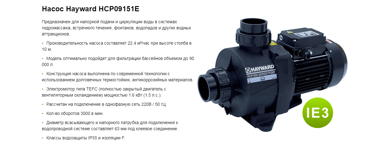 Насос без префильтра Hayward HCP09151E2 IE2. Аналог моделей BCD150/KNG150. Напорные (подающие) насосы используются для работы систем гидромассажа, встречного течения, фонтанов, водопадов и других водных аттракционов. Корпус из термически обработанного пластика с усилением из стекловолокна. Крыльчатка из норила со стальной втулкой (SS303). Подходит для работы с соленой и морской водой. Соединение корпуса 2" нар. резьба. Комплектуется муфтами переходными на 63 мм под клей.