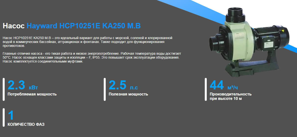 Мощный насос Hayward HCP10251E KA250 M.B - это отличный вариант для обеспечения работы водного оборудования в общественных бассейнах, аттракционах и фонтанах. Подходит для работы с соленой и морской водой. Насос обладает низким энергопотреблением.