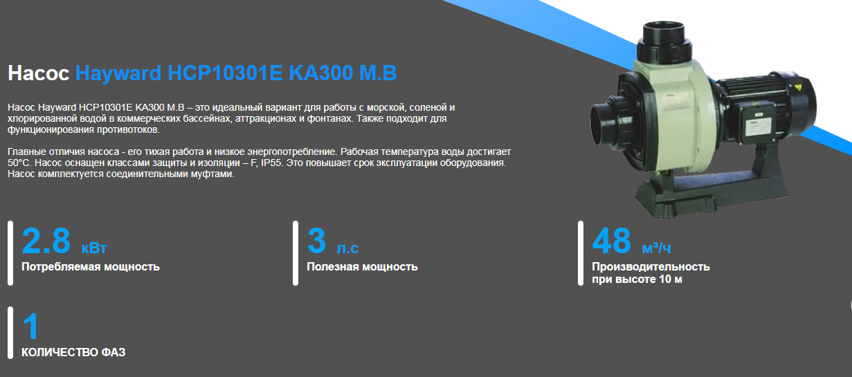 Мощный насос Hayward HCP10301E KA300 M.B - это отличный вариант для обеспечения работы водного оборудования в общественных бассейнах, аттракционах и фонтанах. Подходит для работы с соленой и морской водой. Насос обладает низким энергопотреблением.
