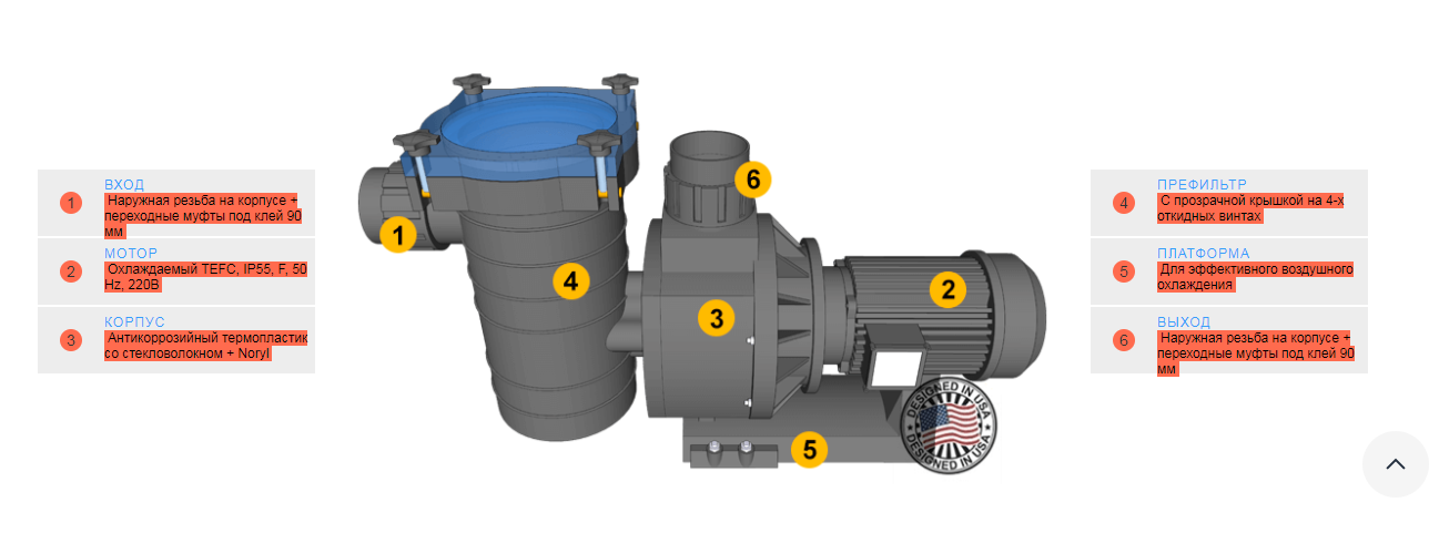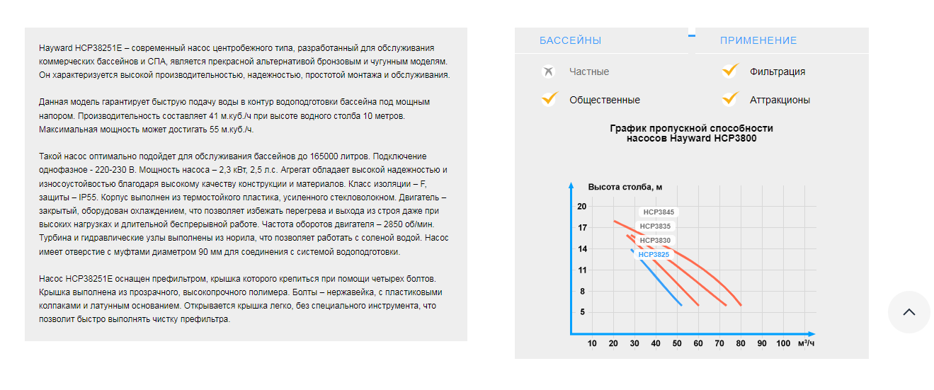 Центробежный насос Hayward HCP38251E c префильтром для коммерческих бассейнов. Используется для фильтрации и циркуляции воды. Линейка HCP была разработана компанией Hayward как надежная альтернатива тяжелым чугунным и бронзовым насосам для коммерческого применения. Изготовлены из легкого прочного термопластика, обогащенного стекловолокном. Гидравлические узлы из Noryl позволяют использовать насосы с соленой и морской водой. Оснащен префильтром большой емкости. Прозрачная крышка префильтра на 4-х легкооткидных винтах из нержавейки. В насосе используется высокомощный охлаждаемый мотор TEFC.