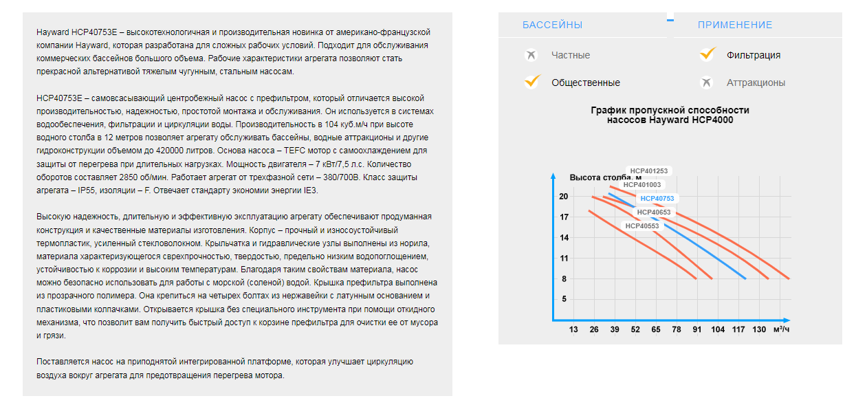 Самовсасывающий центробежный насос Hayward HCP40753E c префильтром для коммерческих бассейнов. Используется для фильтрации и циркуляции воды. Линейка HCP была разработана компанией Hayward как надежная альтернатива тяжелым чугунным и бронзовым насосам для коммерческого применения. Изготовлены из легкого прочного термопластика, обогащенного стекловолокном. Гидравлические узлы из Noryl позволяют использовать насосы с соленой и морской водой. Оснащен префильтром большой емкости. Прозрачная крышка префильтра на 4-х легкооткидных винтах из нержавейки. В насосе используется высокомощный охлаждаемый мотор TEFC отвечающий стандарту экономии энергии IE3 (сверхвысокий класс энергоэффективности). Модель 400/700В. Предназначен для работы в бассейнах объемом до 418000 литров.