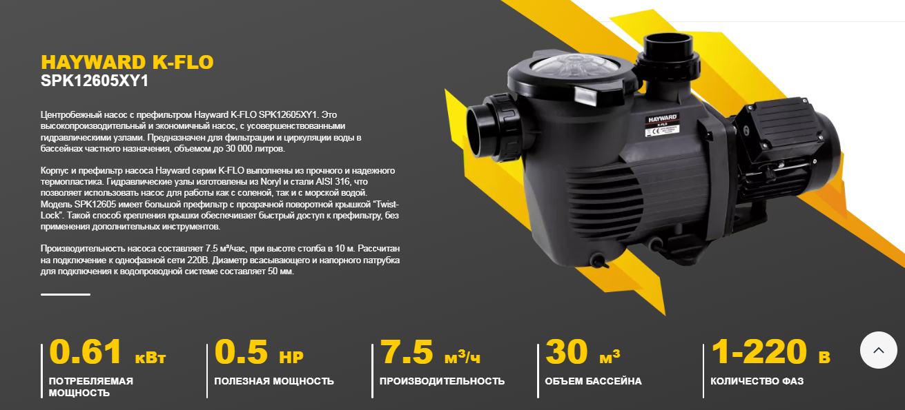 Центробежный насос Hayward K-FLO SPK12605XY1 с префильтром. Используется для фильтрации и циркуляции воды в частных бассейнах, объемом до 30000 л. Корпус насоса и префильтра выполнены из термопластика. Гидравлические узлы из Noryl и стали AISI 316 позволяют использовать насос для работы с соленой и морской водой. Оснащен префильтром большой емкости. При монтаже насоса требуется дополнительная установка автомата защиты двигателя.