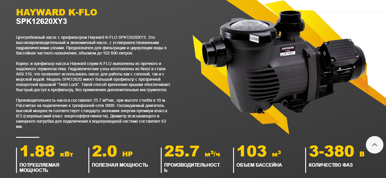 Центробежный насос Hayward K-FLO SPK12620XY3 с префильтром. Используется для фильтрации и циркуляции воды в частных бассейнах, объемом до 102800 л. Корпус насоса и префильтра выполнены из термопластика. Гидравлические узлы из Noryl и стали AISI 316 позволяют использовать насос для работы с соленой и морской водой. Оснащен префильтром большой емкости. При монтаже насоса требуется дополнительная установка автомата защиты двигателя. В насосе используется высокомощный охлаждаемый мотор, отвечающий стандарту энергоэффективности IE3 (сверхвысокий класс), что гарантирует экономный расход электроэнергии.