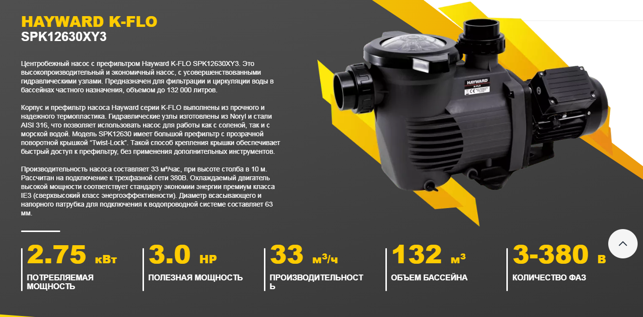 Центробежный насос Hayward K-FLO SPK12630XY3 с префильтром. Используется для фильтрации и циркуляции воды в частных бассейнах, объемом до 132000 л. Корпус насоса и префильтра выполнены из термопластика. Гидравлические узлы из Noryl и стали AISI 316 позволяют использовать насос для работы с соленой и морской водой. Оснащен префильтром большой емкости. При монтаже насоса требуется дополнительная установка автомата защиты двигателя. В насосе используется высокомощный охлаждаемый мотор, отвечающий стандарту энергоэффективности IE3 (сверхвысокий класс), что гарантирует экономный расход электроэнергии.