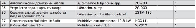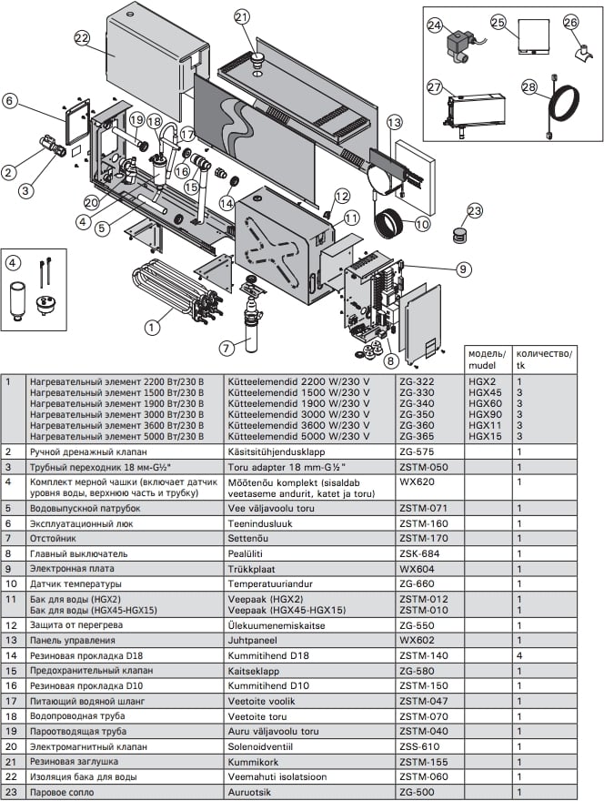 Комплект поставки включает парогенератор, панель управления, датчик температуры ZG-660 и одно паровое сопло Harvia ZG500.