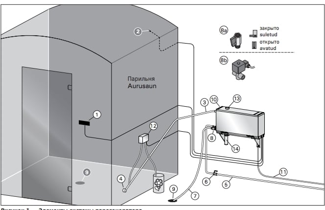 Комплект поставки включает парогенератор, панель управления, датчик температуры ZG-660 и одно паровое сопло Harvia ZG500.