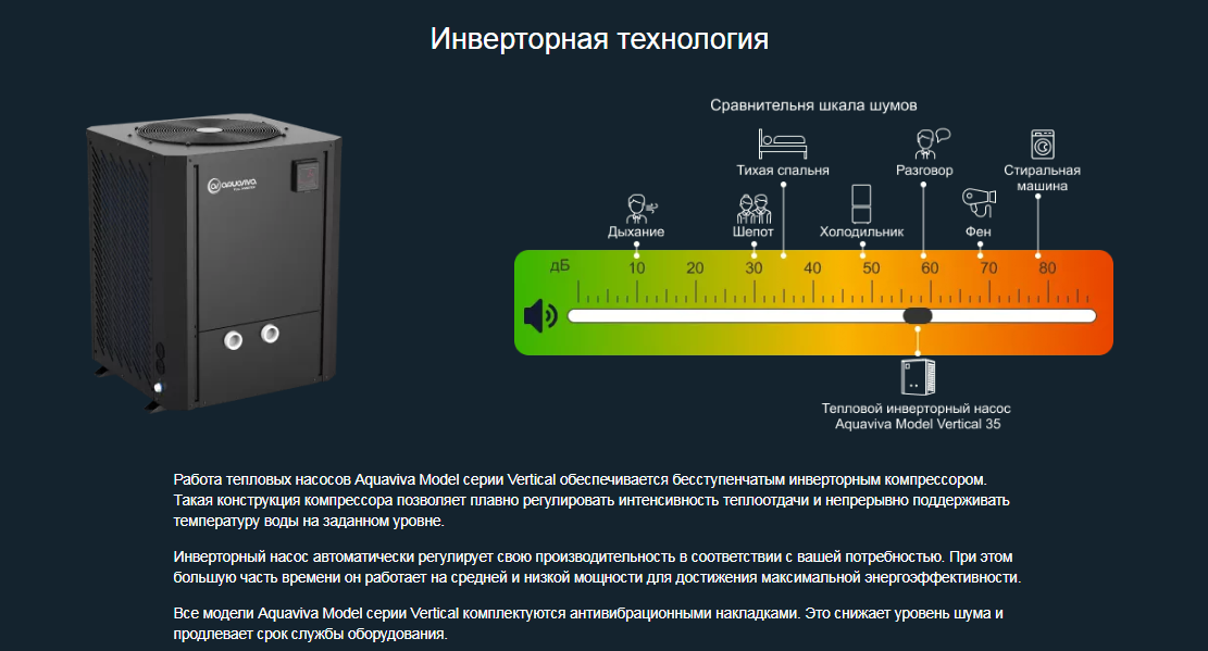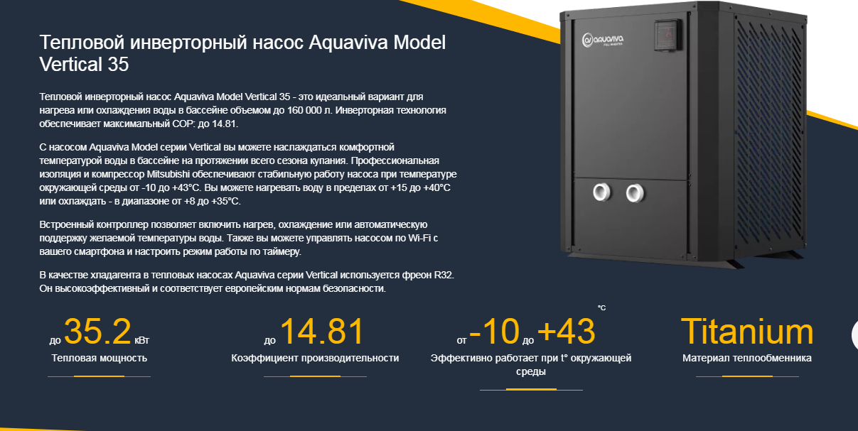 Тепловой инверторный насос Aquaviva Model Vertical 35 - это идеальный вариант для нагрева или охлаждения воды в коммерческих бассейнах объемом до 160 000 л. Устройство продлит купальный сезон и обеспечит высокий уровень комфорта.