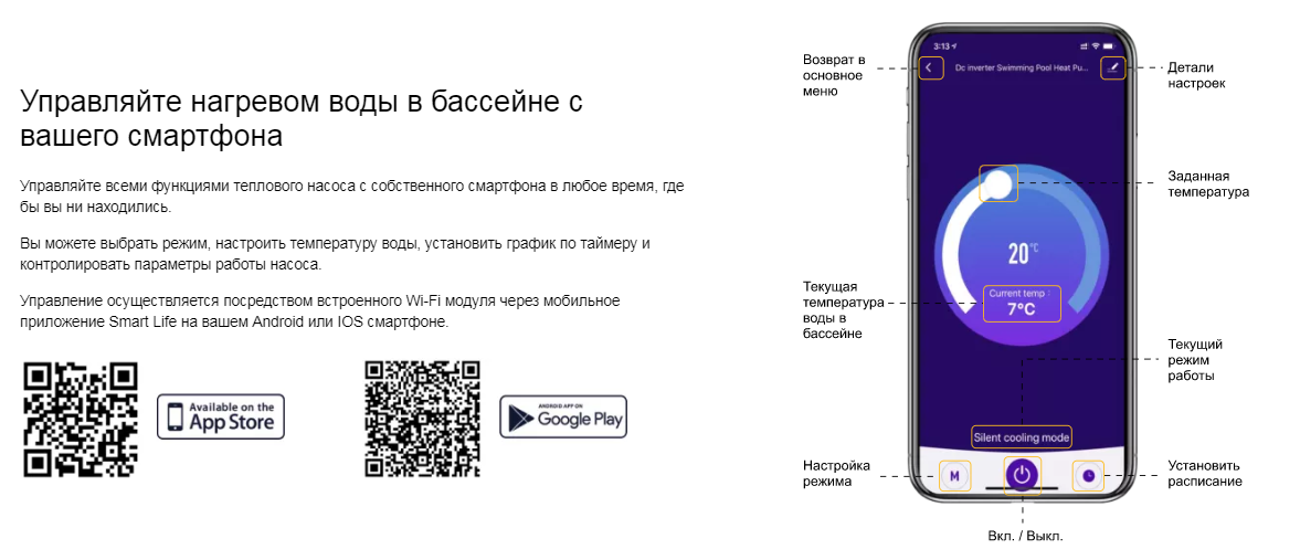 Тепловой насос оснащен титановым теплообменником, который позволяет работать с хлорированной и морской водой, гарантируя надежную и долговечную работу устройства без коррозии. Также, доступно Wi-Fi управление с вашего смартфона, через приложение Smart Life, которое можно загрузить на Google Play или App Store.