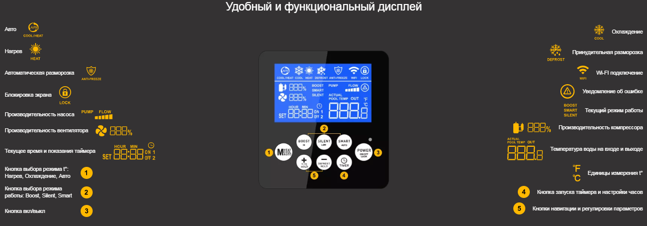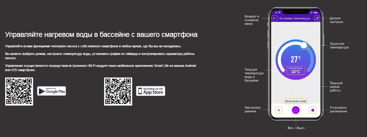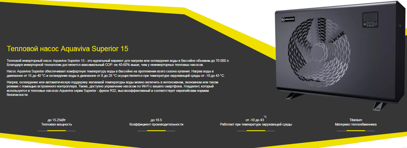 Тепловой инверторный насос Aquaviva Superior 15 FI15RW - идеальный вариант для нагрева или охлаждения воды в бассейне объёмом до 70 000 л. Устройство продлит купальный сезон и обеспечит высокий уровень комфорта. Тепловой насос оснащен титановым теплообменником, устойчивым к коррозии. Это гарантирует надежность и долгий срок службы устройства. Титановый теплообменник позволяет насосу работать с хлорированной и соленой морской водой. Встроенные предохранительные устройства обеспечивают защиту компрессора, насоса от перегрузок, скачков давления при недостаточном потоке воды. Автоматический таймер обеспечивает включение/выключение насоса по заданному графику. Также доступно Wi-Fi управление с вашего смартфона, через приложение Smart Life, которое можно загрузить на Google Play или App Store.