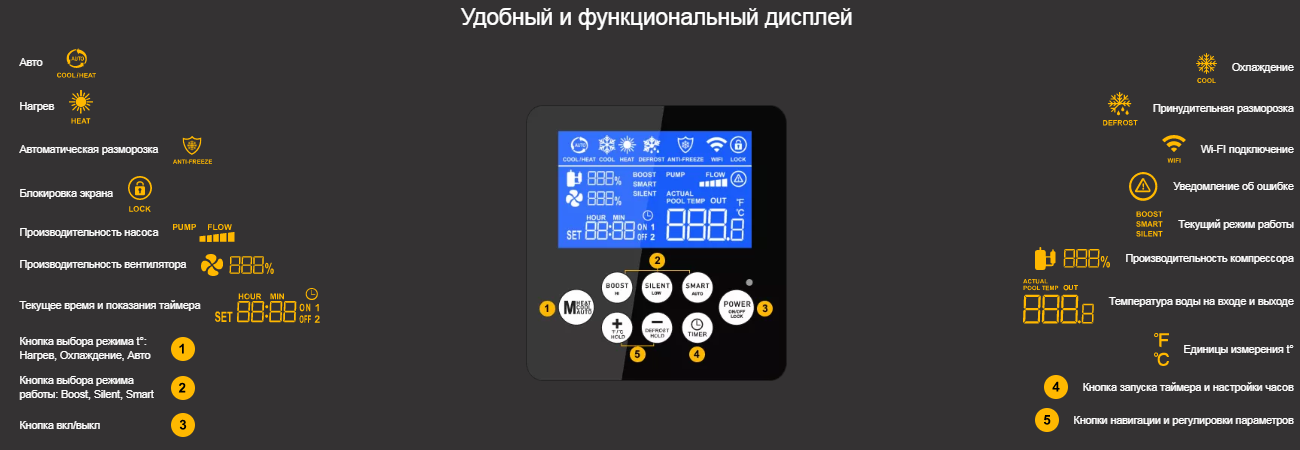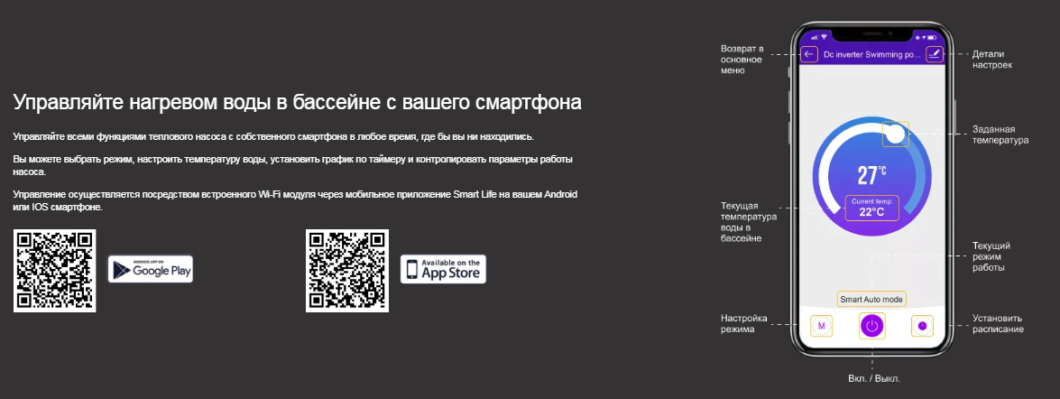 Тепловой инверторный насос Aquaviva Superior 27 FI27RW - идеальный вариант для нагрева или охлаждения воды в бассейне объёмом до 120 000 л. Устройство продлит купальный сезон и обеспечит высокий уровень комфорта. Тепловой насос оснащен титановым теплообменником, устойчивым к коррозии. Это гарантирует надежность и долгий срок службы устройства. Титановый теплообменник позволяет насосу работать с хлорированной и соленой морской водой. Встроенные предохранительные устройства обеспечивают защиту компрессора, насоса от перегрузок, скачков давления при недостаточном потоке воды. Автоматический таймер обеспечивает включение/выключение насоса по заданному графику. Также доступно Wi-Fi управление с вашего смартфона, через приложение Smart Life, которое можно загрузить на Google Play или App Store.