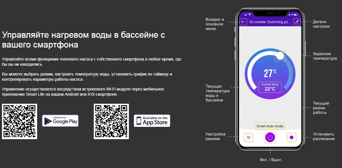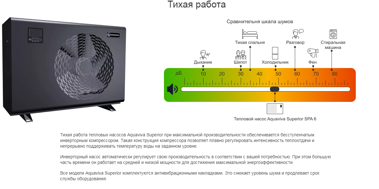 Тепловой инверторный насос Aquaviva Superior SPA 6 FI6RWSPA - это идеальный вариант для нагрева или охлаждения воды в СПА бассейне объёмом до 25 000 л. Устройство продлевает купальный сезон и обеспечивает высокий уровень комфорта. Титановый теплообменник позволяет работать с хлорированной и морской водой, гарантируя надежную и долговечную работу устройства без коррозии. Оснащен функцией автоматического включения/выключения электронагревателя и дополнительной защитой от перегрева. Доступно Wi-Fi управление с вашего смартфона, через приложение Smart Life, которое можно загрузить на Google Play или App Store.