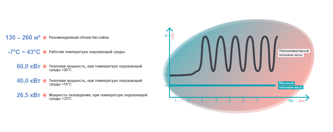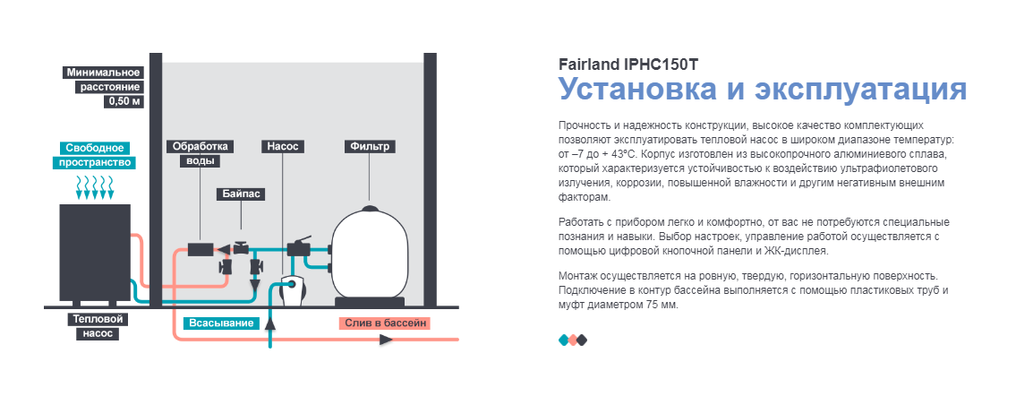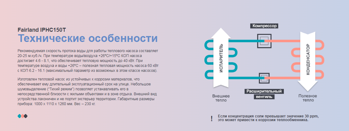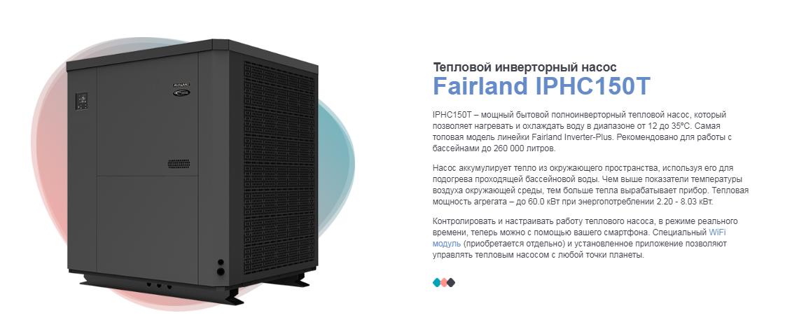 Коммерческий полноинверторный тепловой насос Fairland IPHC150T. Предназначен для нагрева и охлаждения воды в общественных бассейнах, объемом до 260 м³. Благодаря спиралевидному титановому нагревателю, площадь теплообмена увеличена на 30%. Насос можно использовать для работы с соленой и морской водой. В устройстве используются оригинальные японские комплектующие.