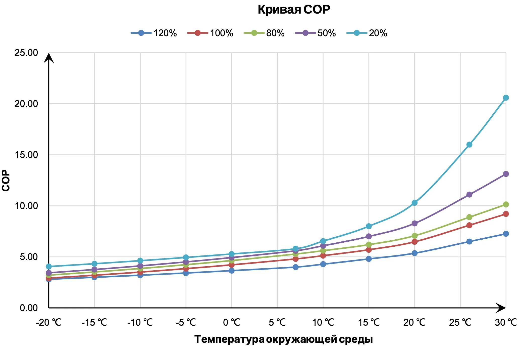 СОР (Coefficient of perfomance) - коэффициент трансформации или коэффициент производительности. Определяет соотношение вырабатываемой тепловой энергии к потребляемой электрической. Является показателем эффективности работы теплового насоса.