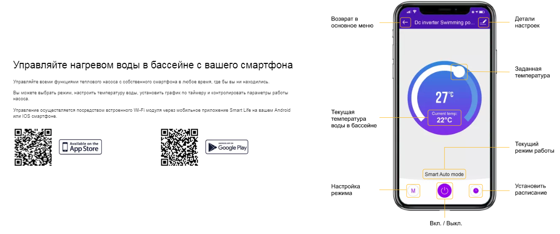 Тепловой насос Aquaviva Model 16 ON16RW - это идеальный вариант для нагрева или охлаждения воды в бассейне объемом до 75 000 л. Устройство продлит купальный сезон и обеспечит высокий уровень комфорта. Насос оснащен титановым теплообменником, который позволяет работать с хлорированной и морской водой, гарантируя надежную и долговечную работу устройства без коррозии. Доступно Wi-Fi управление с вашего смартфона, через приложение Smart Life, которое можно загрузить на Google Play или App Store.