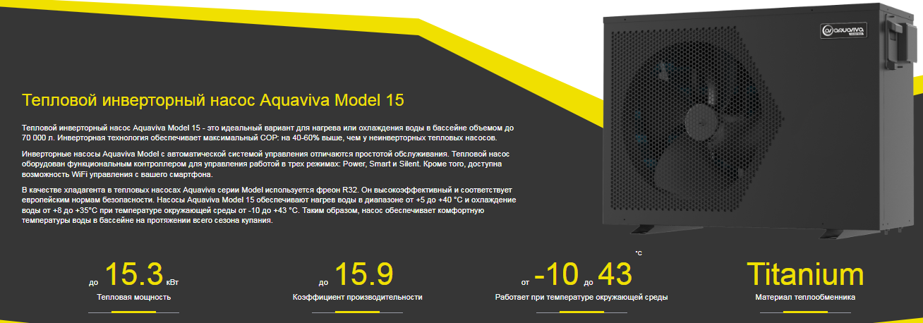 Тепловой насос Aquaviva Model 15 инвертор (30-60 м3, тепло /холод, 15,3 кВт, -10С, WiFi)