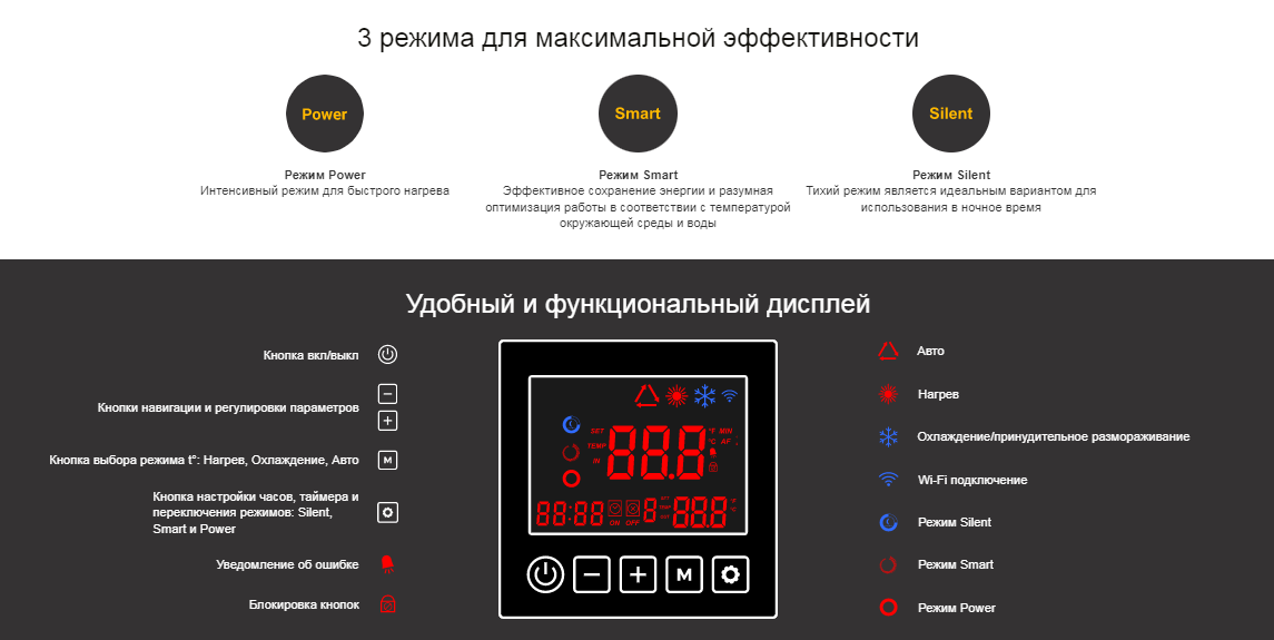 Устройство поддерживает три режима работы – «Power», «Smart» и «Silent». Режим «Power» обеспечивает максимальную производительность для быстрого нагревания или охлаждения воды. Режим «Smart» автоматически адаптирует работу насоса в зависимости от текущих условий, что помогает экономить энергию и поддерживать оптимальную температуру воды. Режим «Silent» минимизирует уровень шума, что особенно важно для использования насоса в ночное время или в условиях, где требуется тишина.