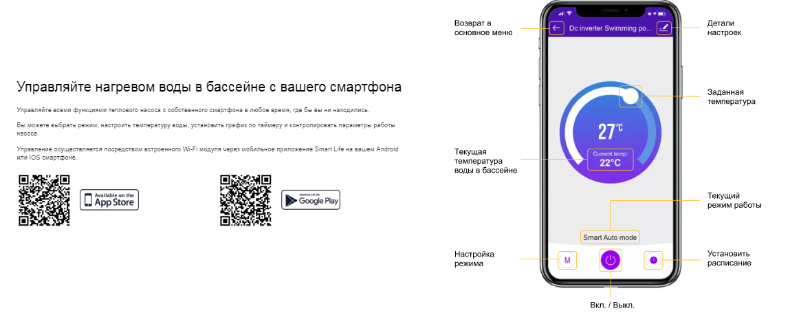 Тепловой насос Aquaviva Model 16 ON16RW - это идеальный вариант для нагрева или охлаждения воды в бассейне объемом до 75 000 л. Устройство продлит купальный сезон и обеспечит высокий уровень комфорта. Насос оснащен титановым теплообменником, который позволяет работать с хлорированной и морской водой, гарантируя надежную и долговечную работу устройства без коррозии. Доступно Wi-Fi управление с вашего смартфона, через приложение Smart Life, которое можно загрузить на Google Play или App Store.