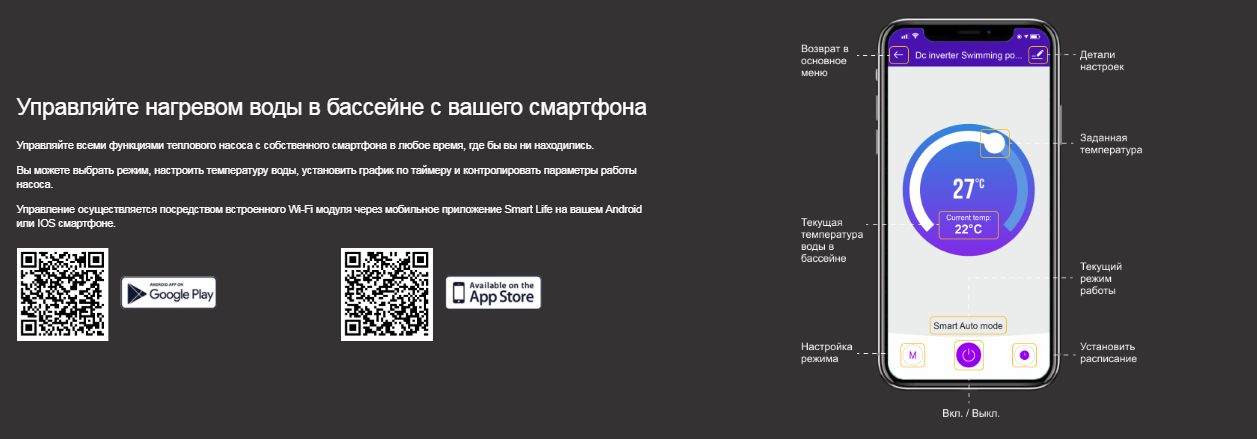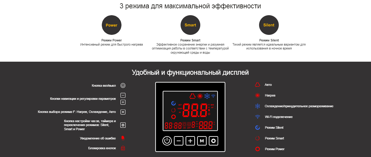 Насос оснащен системой работы в трех режимах – «Power», «Smart» и «Silent». Режим «Power» предназначен для достижения максимальной производительности, позволяя быстро нагреть или охладить воду. Режим «Smart» автоматически адаптирует работу насоса к текущим условиям, экономя энергию и поддерживая комфортную температуру. Режим «Silent» минимизирует уровень шума, что важно для использования насоса в ночное время или в условиях, когда требуется тишина. Гибкая система работы обеспечивает плавную регулировку производительности и оптимальную температуру воды в бассейне.