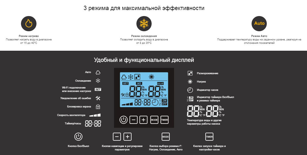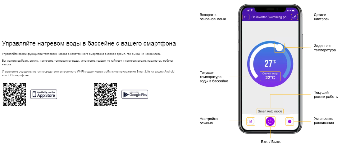 Тепловой насос Aquaviva Model 6 ON/OFF - это идеальный вариант для нагрева или охлаждения воды в бассейне объемом до 20 000 л. Устройство продлит купальный сезон и обеспечит высокий уровень комфорта. Тепловой насос оснащен титановым теплообменником, что гарантирует надежную и долговечную работу устройства без коррозии. Работает с хлорированной и морской водой. Доступно Wi-Fi управление с вашего смартфона, через приложение Smart Life, которое можно загрузить на Google Play или App Store.