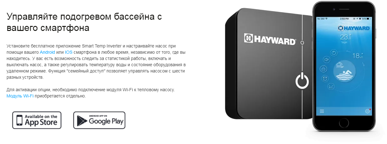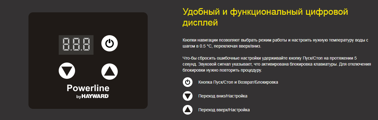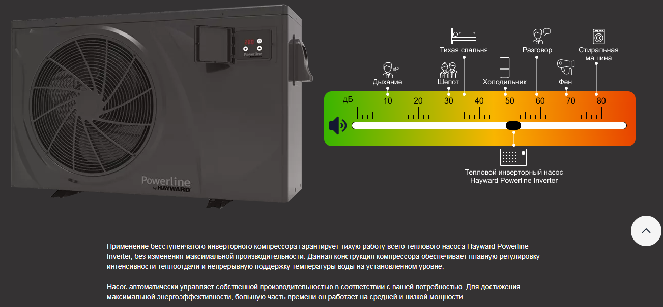 Hayward Powerline Inverter 15 - это тепловой насос с полноинверторной технологией. Подходит для нагрева воды в частных бассейнах объемом до 70 м³. Обеспечивает быстрый нагрев и точное поддержание желаемой температуры. Предназначен для работы при низких температурах до -7°С. Интуитивно понятный пользовательский интерфейс с LED экраном. Бесшумная работа двигателя.